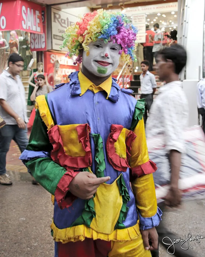 Frankly, I find them scary. But apparently Lajpat Nagar Central Market has unanimously decided that clowns in full make-up and costumes standing outside a store are a good marketing strategy.
